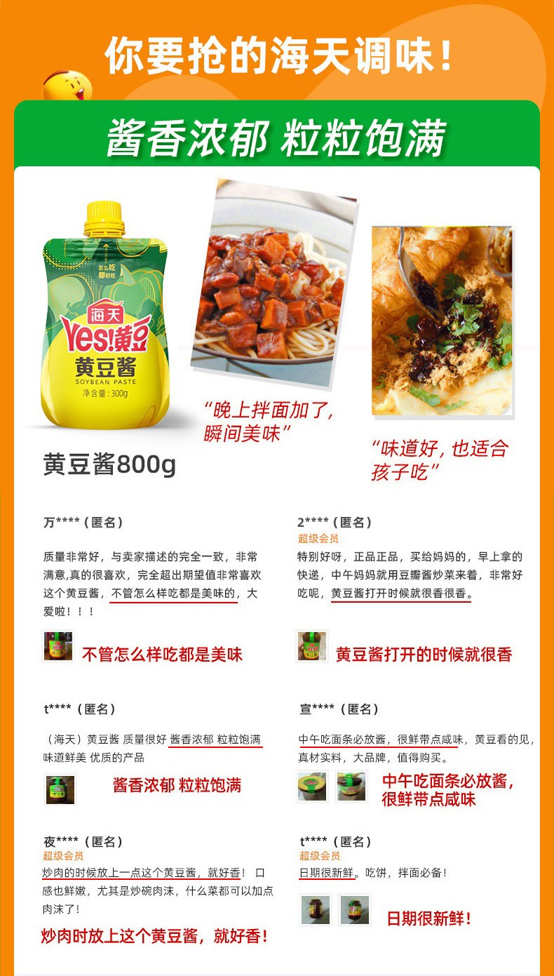 商品名称:海天 甜面酱450g+鲜香熟酱450g+黄豆酱300g+0金标蚝油30g