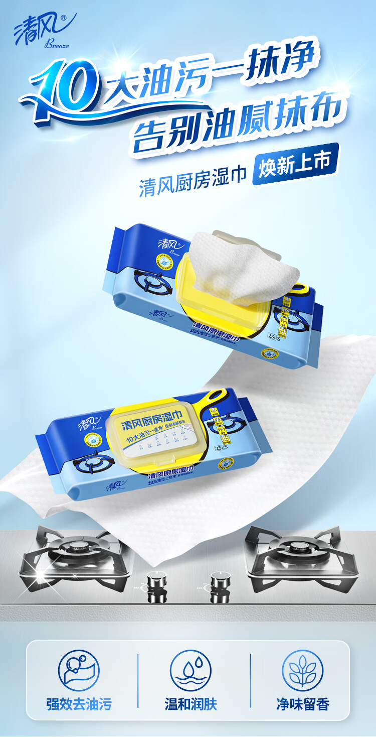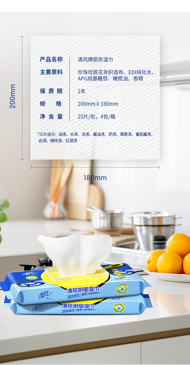 商品名称:清风厨房湿纸巾去污去油厨房湿巾25片4包整箱装 BWB25KE 6922266475498