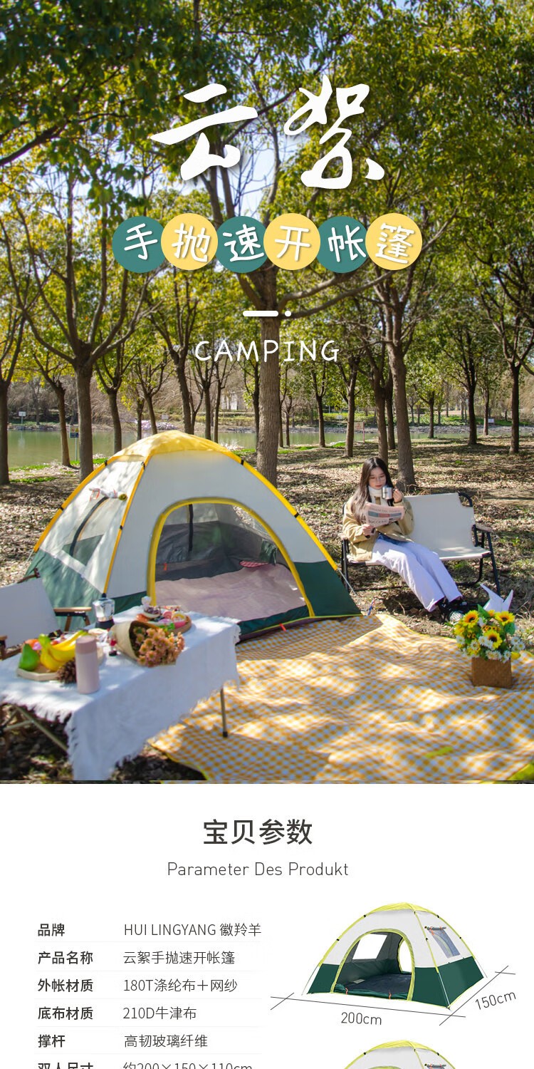 商品名称:徽羚羊 云絮升级拼色款双人全自动速开手抛帐篷 200*150*115 HLY-ZP-22007