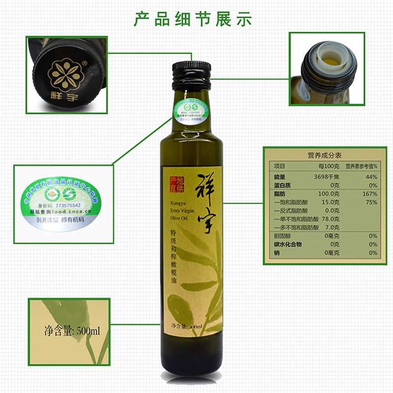 商品名称:祥宇有机特级初榨橄榄油庄园500ml单盒
