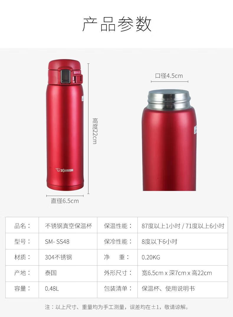 商品名称:象印-不锈钢真空保温杯480ml BA黑色/RA红色/NL金色 下单备注颜色 SM-SS48S