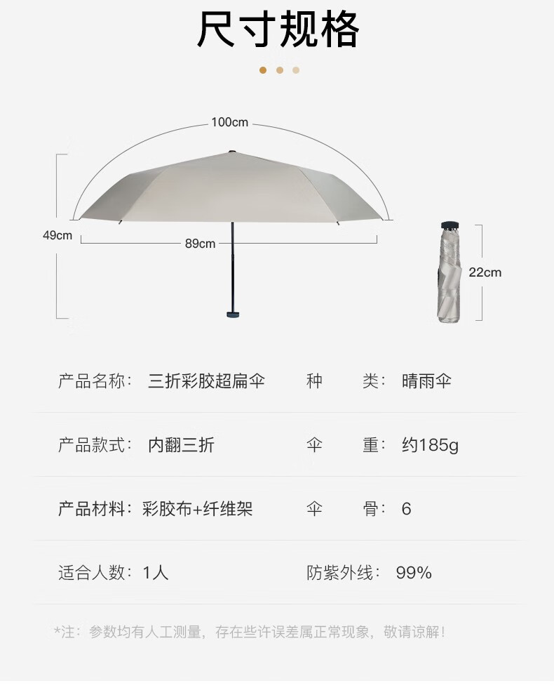 商品名称:红叶 三折彩胶超扁伞3533 藏青色/粉色/浅蓝/浅绿/香槟色 下单备注颜色 6926991135337