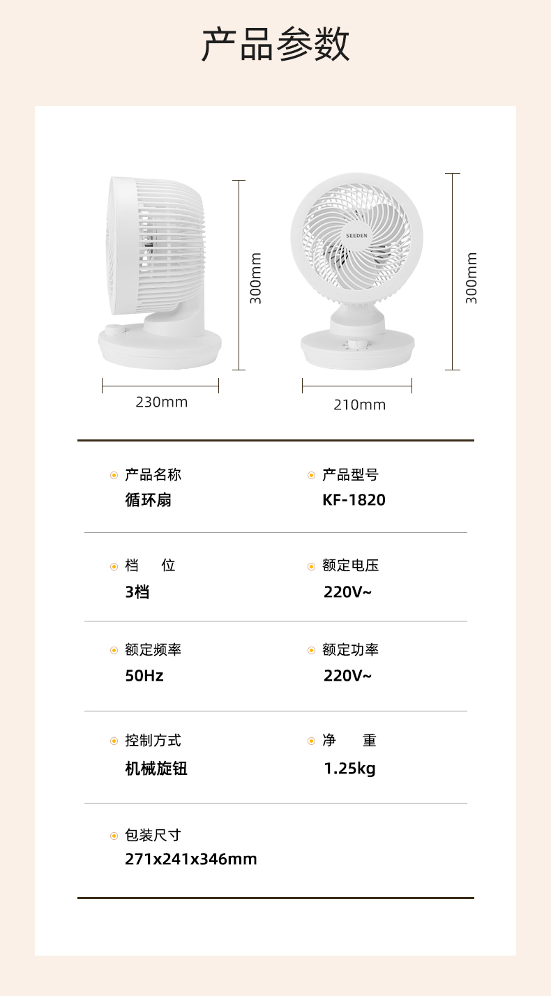 商品名称:SEEDEN/西点 家用办公宿舍7寸旋钮3档台式空气循环扇KF-1820 白色