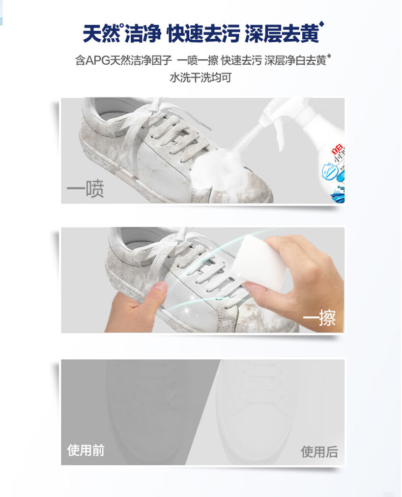 商品名称:立白小白白小白鞋喷喷净280g天然洁净快速去污温和不伤鞋亲肤不伤手 6920174766127