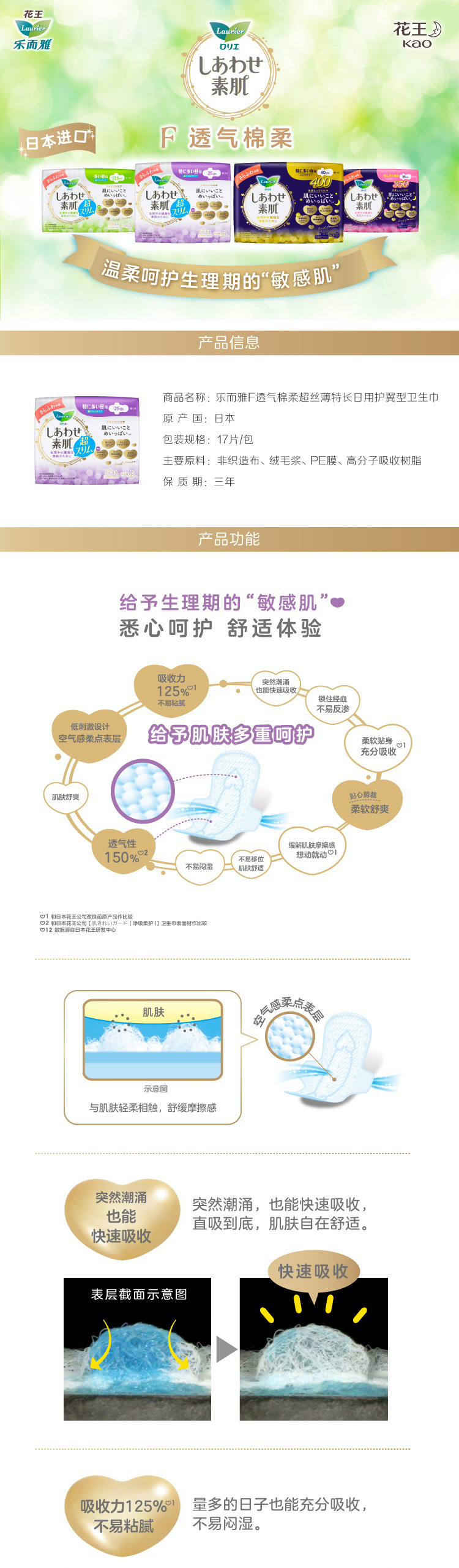商品名称:花王 乐而雅F透气棉柔超丝薄特长日用25cm护翼型卫生巾17片4901301282750