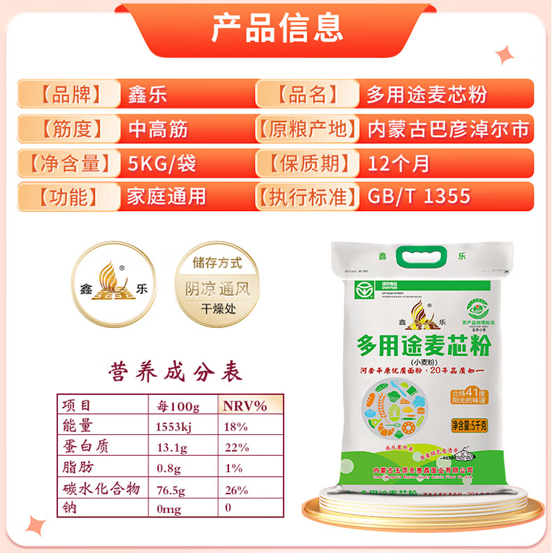 商品名称:鑫乐多用途麦芯粉5kg名优产品内蒙河套平原面粉高筋面粉国家地标 6943724050224