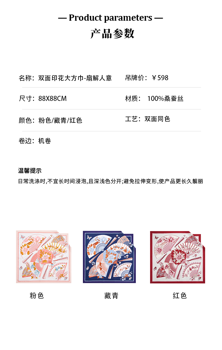 商品名称:万事利丝巾大方巾扇解人意 藏青 / 粉色 / 红色可选 下单备注颜色