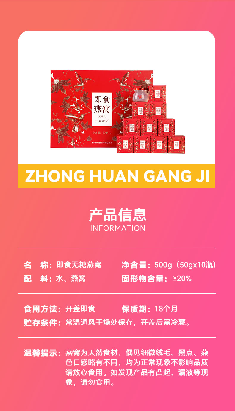 商品名称:中環港记 小红瓶系列 20%无糖即食燕窝礼盒50g*10瓶*1盒 6971749894158