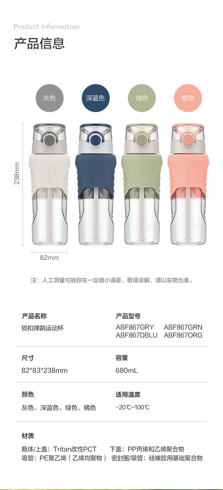 商品名称:乐扣乐扣 锁扣弹跳运动杯680ml ABF867 绿色6943819158897/橙色6943819158903/蓝色6943819158910/灰色6943819158927下单备注颜色