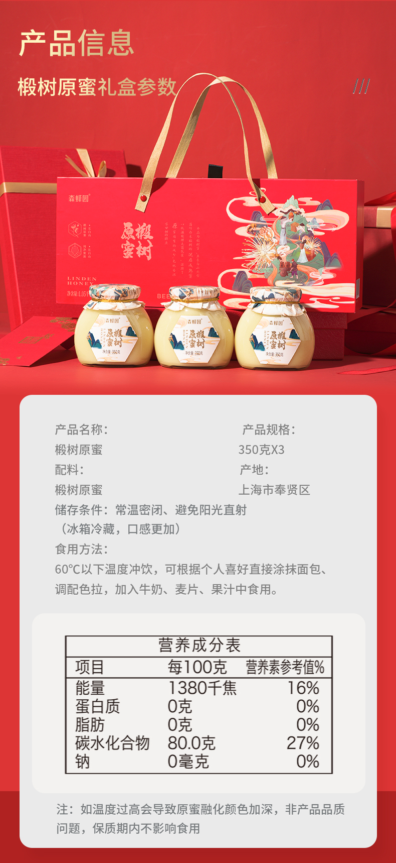 商品名称:森蜂园 椴树原蜜礼盒350g*3瓶