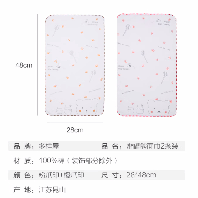 商品名称:多样屋 蜜罐熊面巾2条装 粉爪印/橙爪印 25*50cm