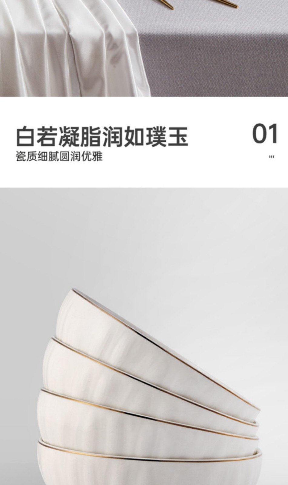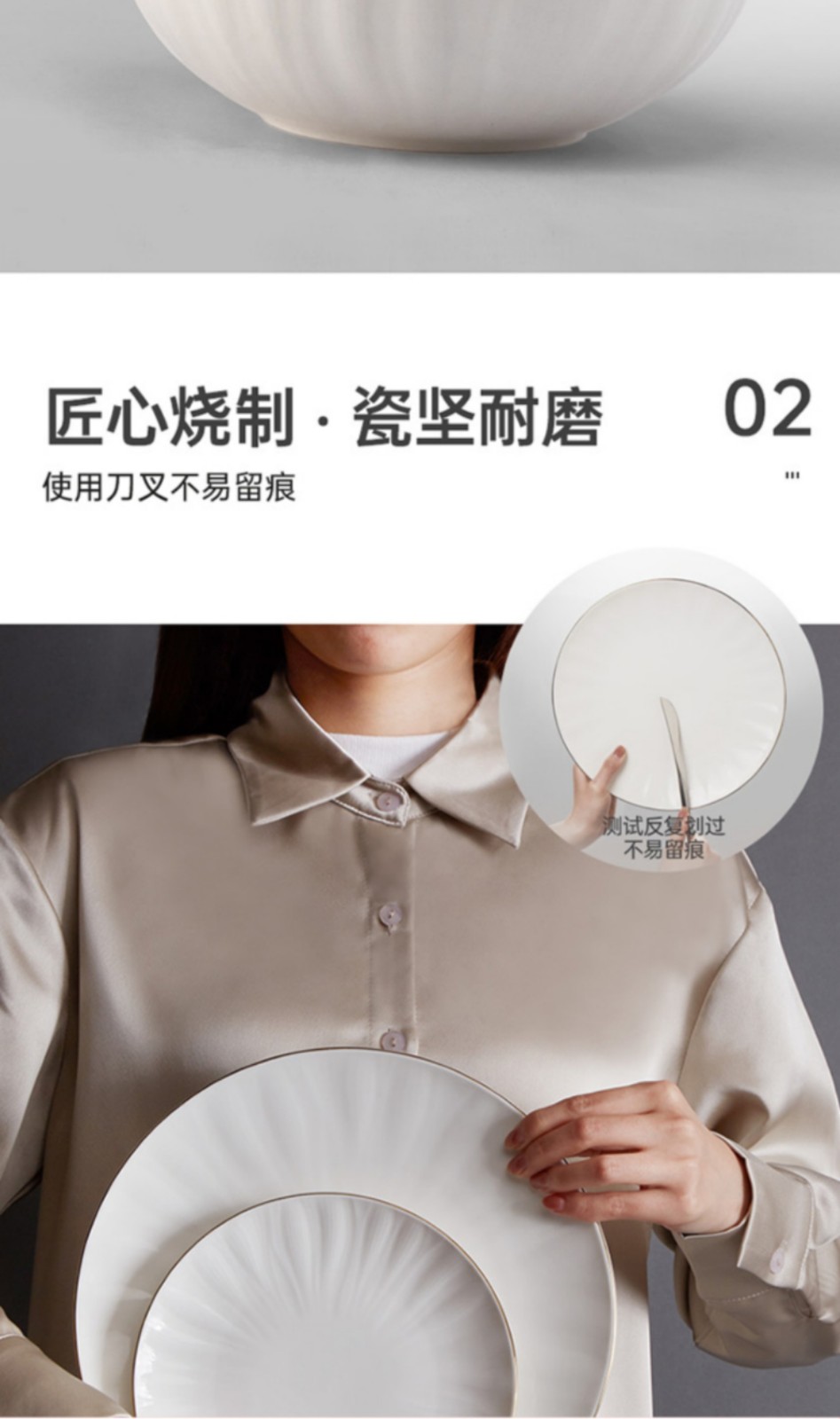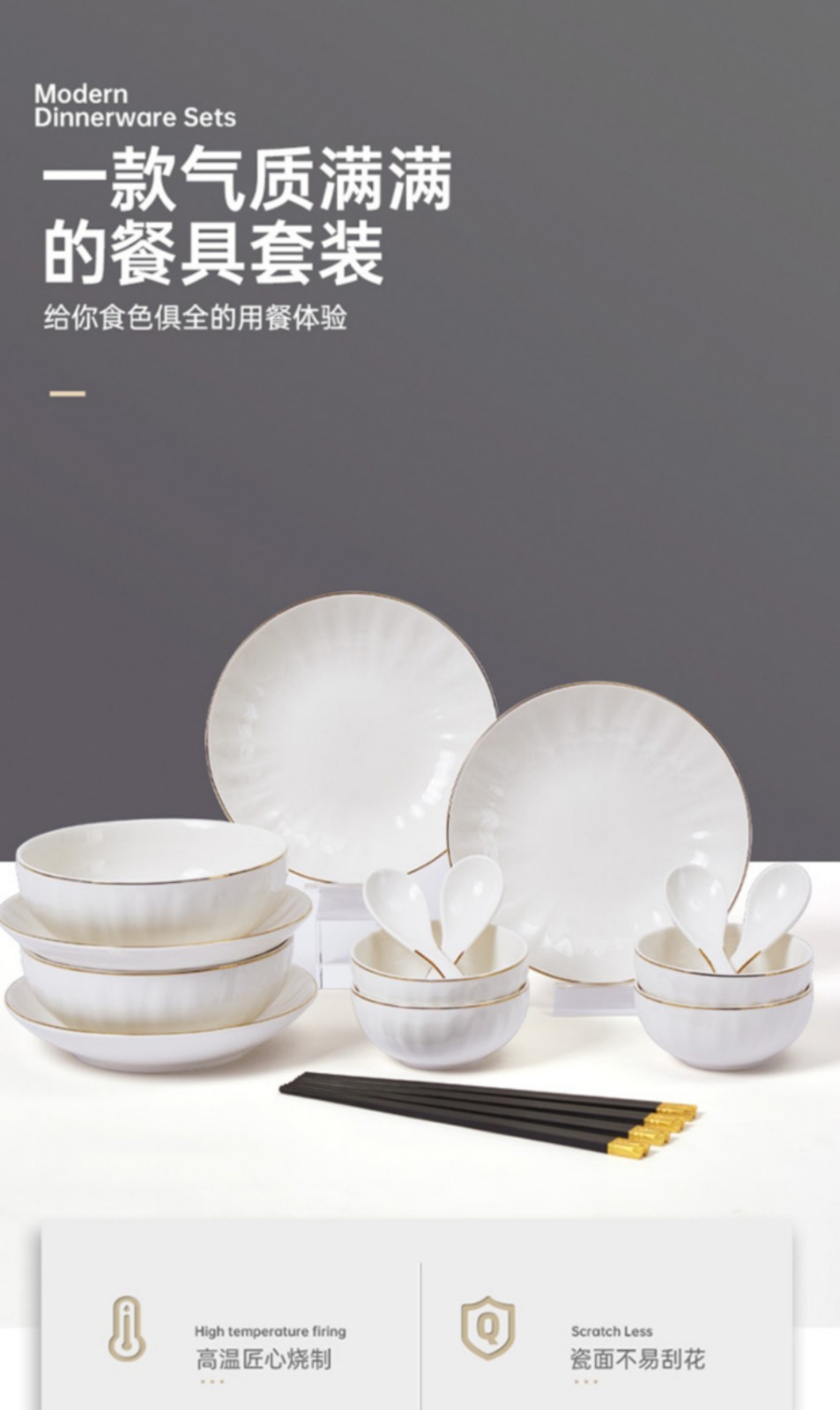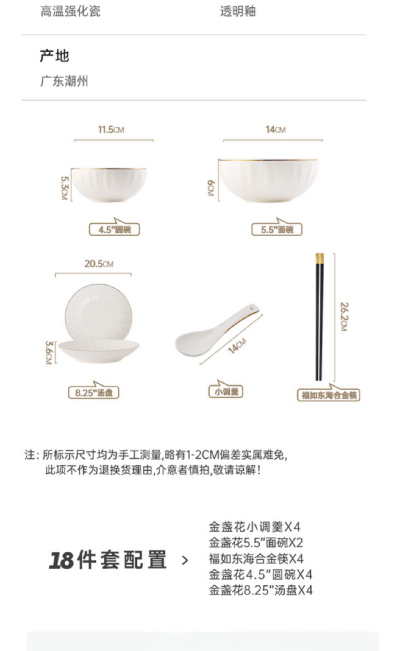 小调羹*4 ; 4.5''饭碗*4; 5.5"面碗*2;8.25''汤盘*4;福如东海合金筷*6