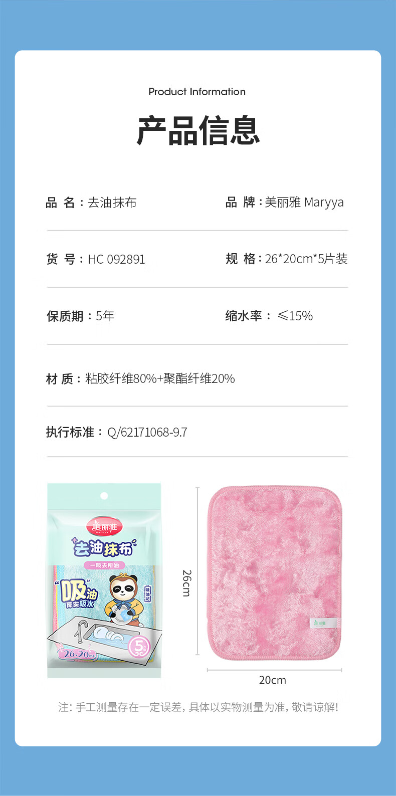 商品名称:美丽雅去油抹布 26*20cm5片 HC092891 6923074092891 偏远另加运费
