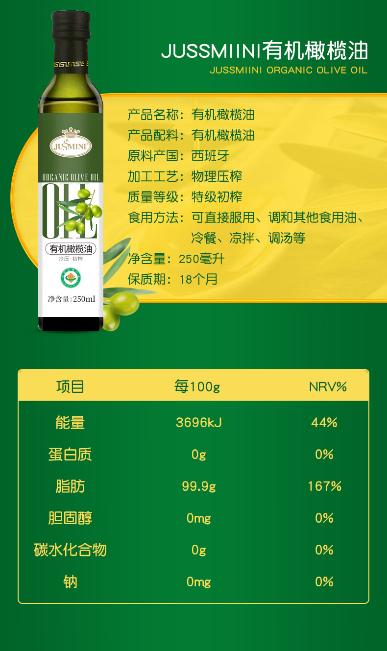 商品名称:JUSSMINI 有机橄榄油250ml 6971286902958