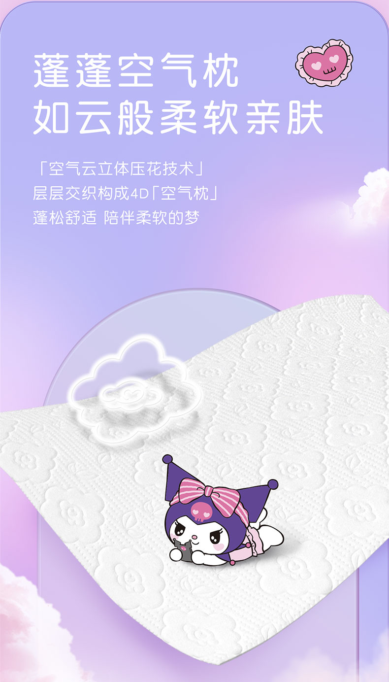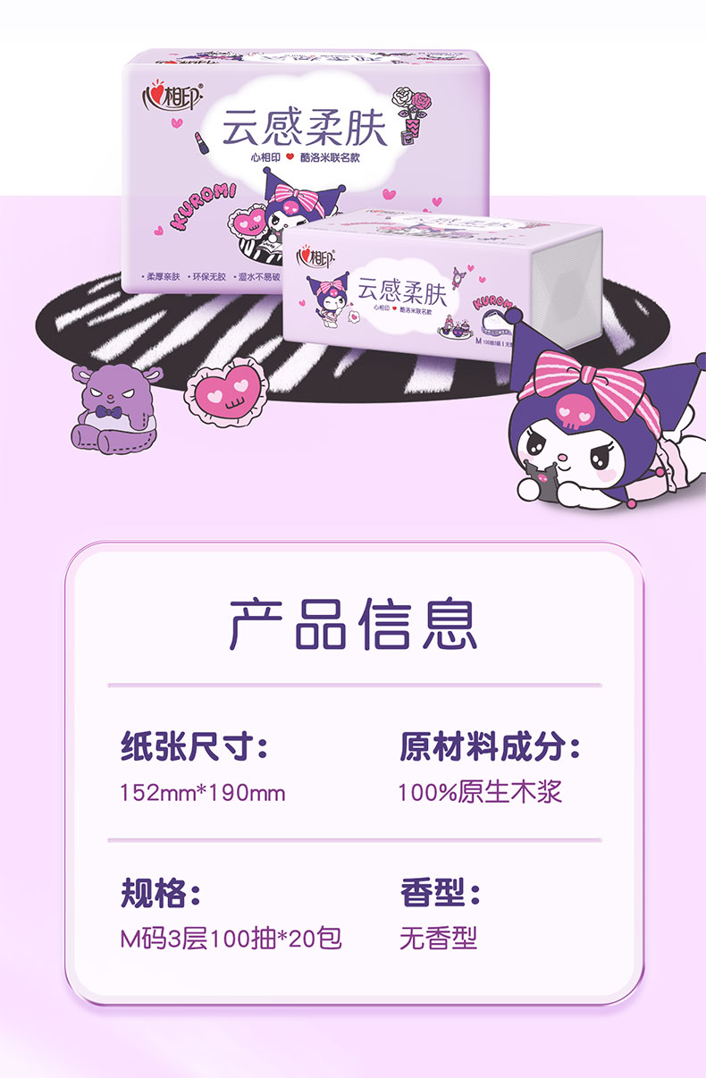 商品名称:心相印 云感100抽20包三层立体压花塑装面巾纸三丽鸥联名款(M码)DT18100(箱装) A0001656 6903244955584