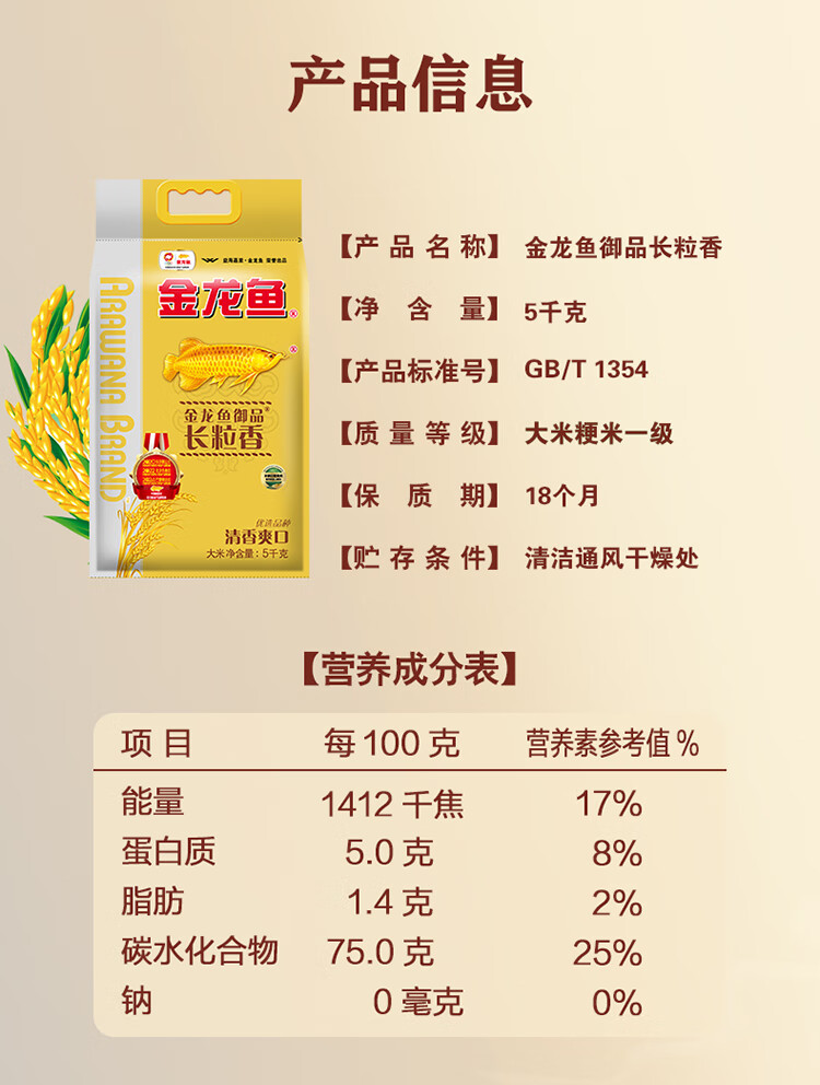 商品名称:金龙鱼 御品长粒香大米5kg 6948195858553 偏远另加运费